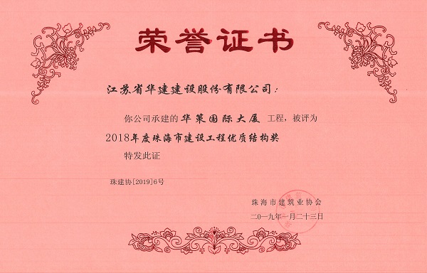 華策國際大廈獲2018年度珠海市建設工程優質結構獎