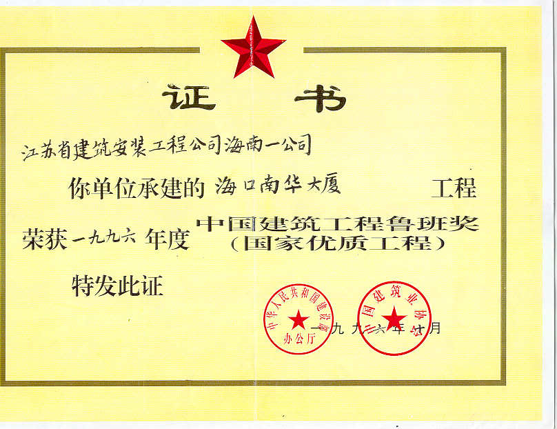 海口市南華大廈工程于1994年5月竣工,1995年6月被評(píng)為海南省優(yōu)質(zhì)樣板工程,1995年12月被評(píng)為建設(shè)部?jī)?yōu)質(zhì)樣板工程,1996年10月榮獲建筑工程魯班獎(jiǎng)。