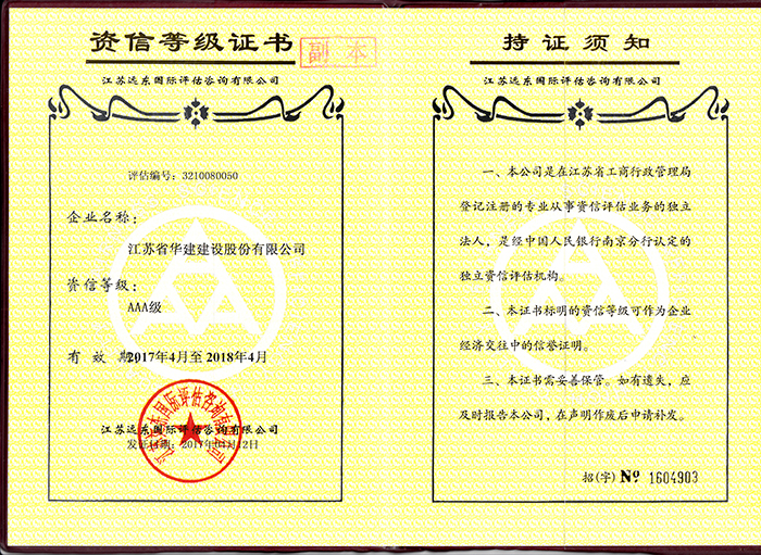 經(jīng)江蘇遠(yuǎn)東國際評估咨詢有限公司專家委員會審定,江蘇省華建建設(shè)股份有限公司資信等級為AAA級。